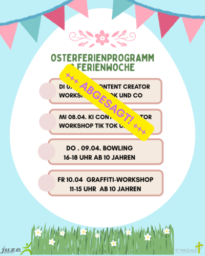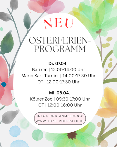 Aufgrund der Absage und der damit verbundenden sehr kurzen Vorlaufzeit, bitten wir Sie sich formlos per E-Mail – team@juze-roesrath.de – bei uns für das Alternativprogramm am 07. & 08. April 2026 anzumelden! Vielen Dank!