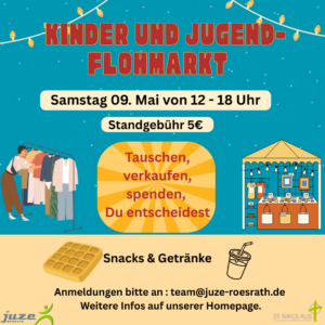 Am 09.05. (Samstag) veranstalten wir zum ersten Mal einen Kinder- & Jugendflohmarkt. Die Anmeldung ist ab sofort möglich und erfolgt per Mail. Alle Infos dazu gibt es hier: Juze Flohmarkt 2026 Infobrief