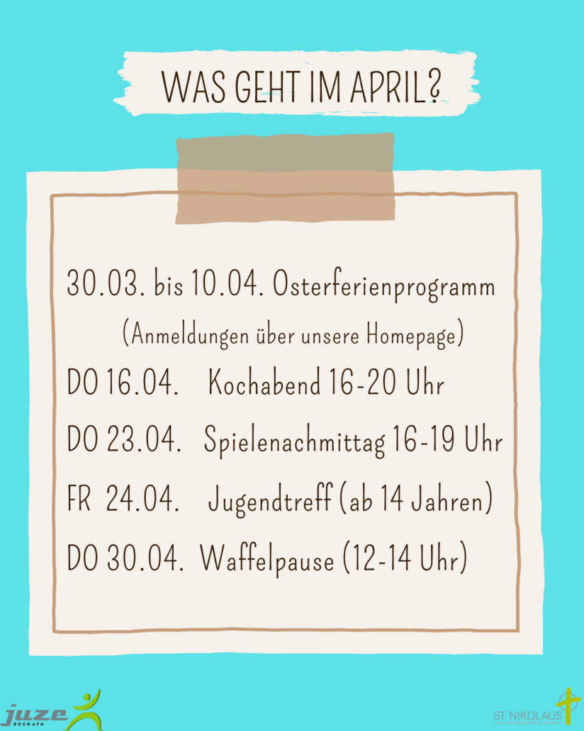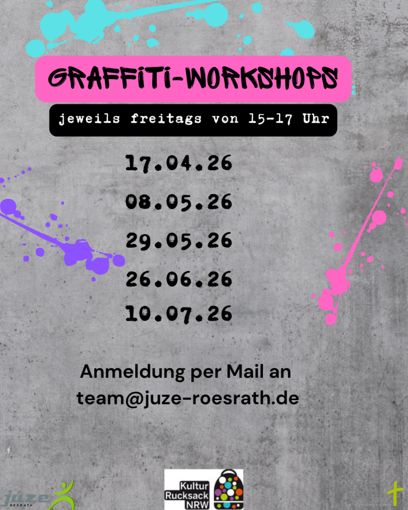 Anmeldungen für den Kochabend (16.04), den Graffiti-Workshop (17.04.) und den Spielenachmittag (23.04.) bitte per Mail an: team@juze-roesrath.de